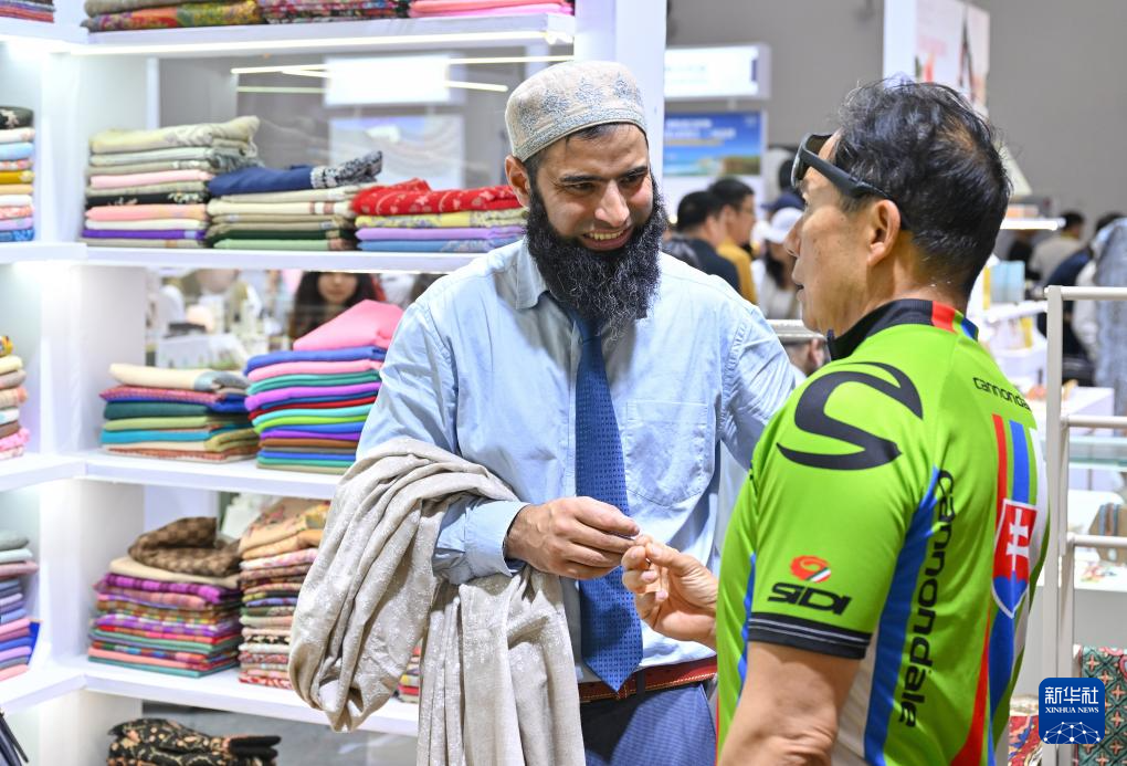 4月17日,乌兹别克斯坦展商在消博会上向观众介绍产品。