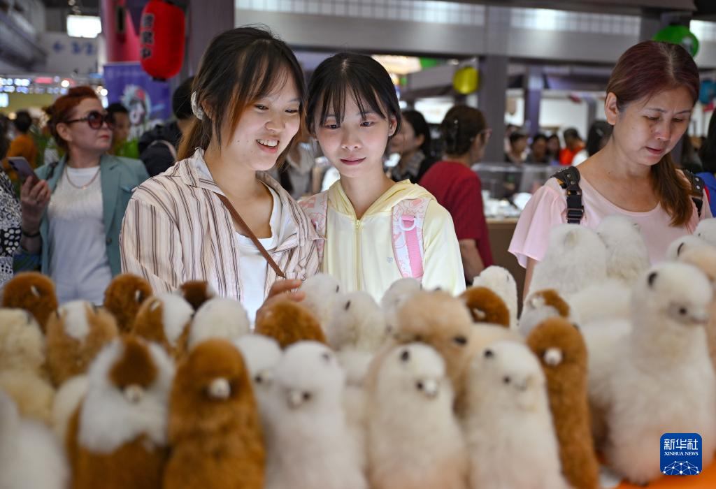 4月17日,观众在消博会现场选购澳大利亚羊驼玩偶。