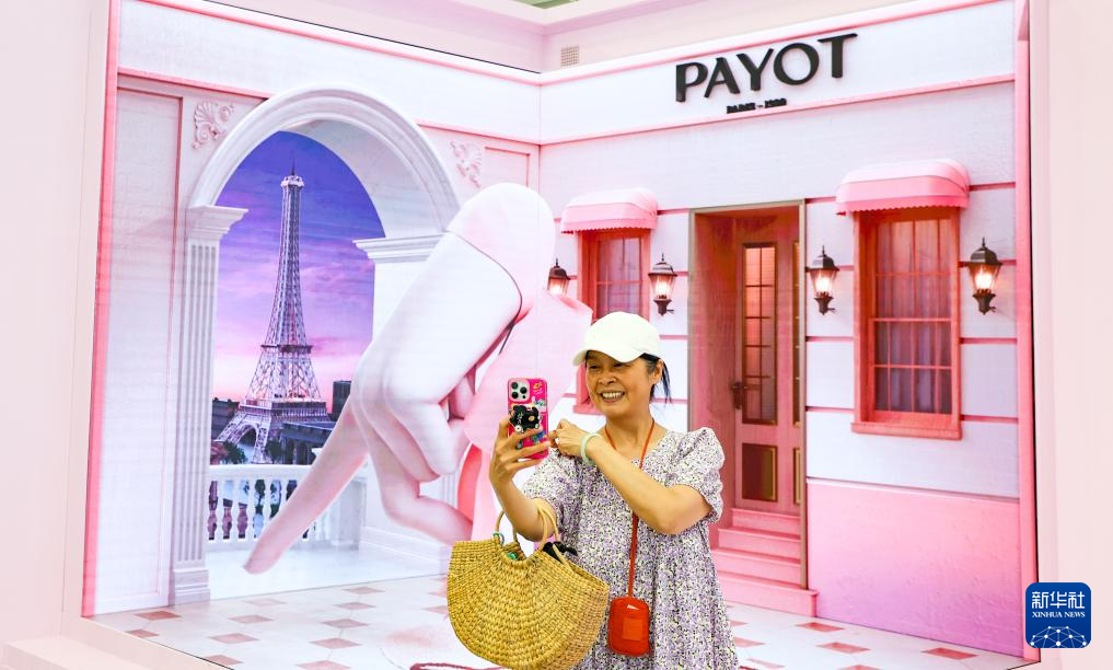 4月17日,观众在第五届消博会时尚生活消费展区自拍留念。
