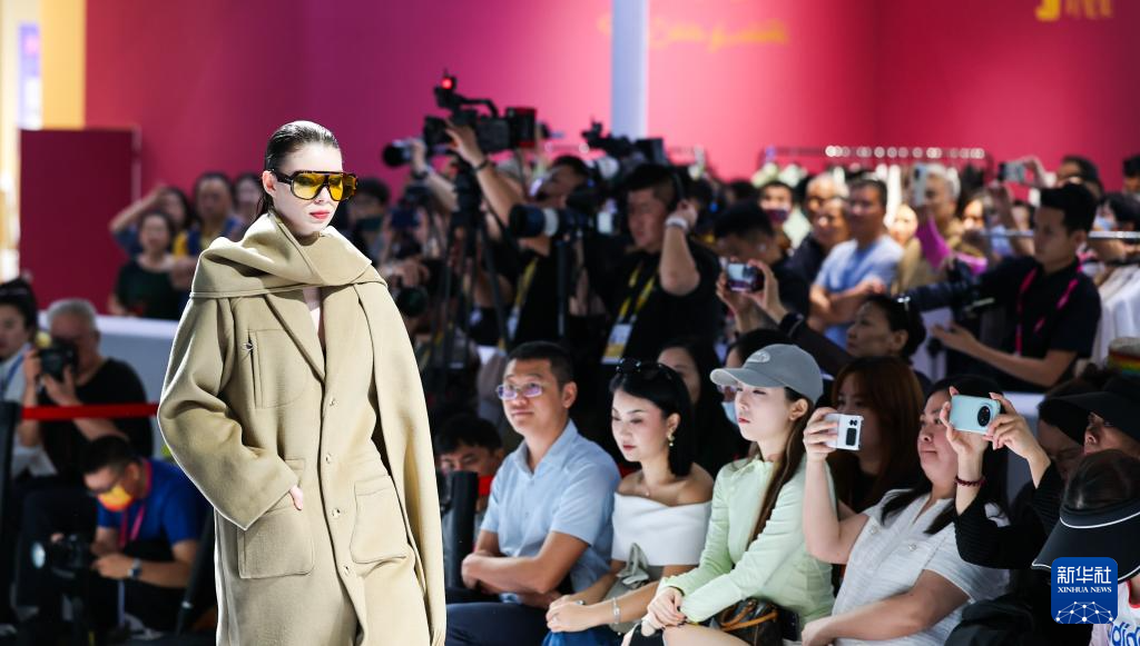 4月17日,观众在第五届消博会时尚生活消费展区观看时装秀。