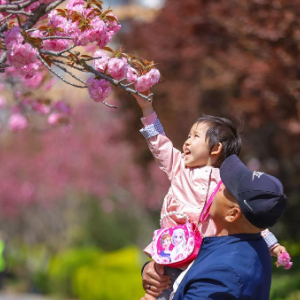 4月16日,小朋友在山东省青岛市李沧区九水街道衡水路赏花游玩。