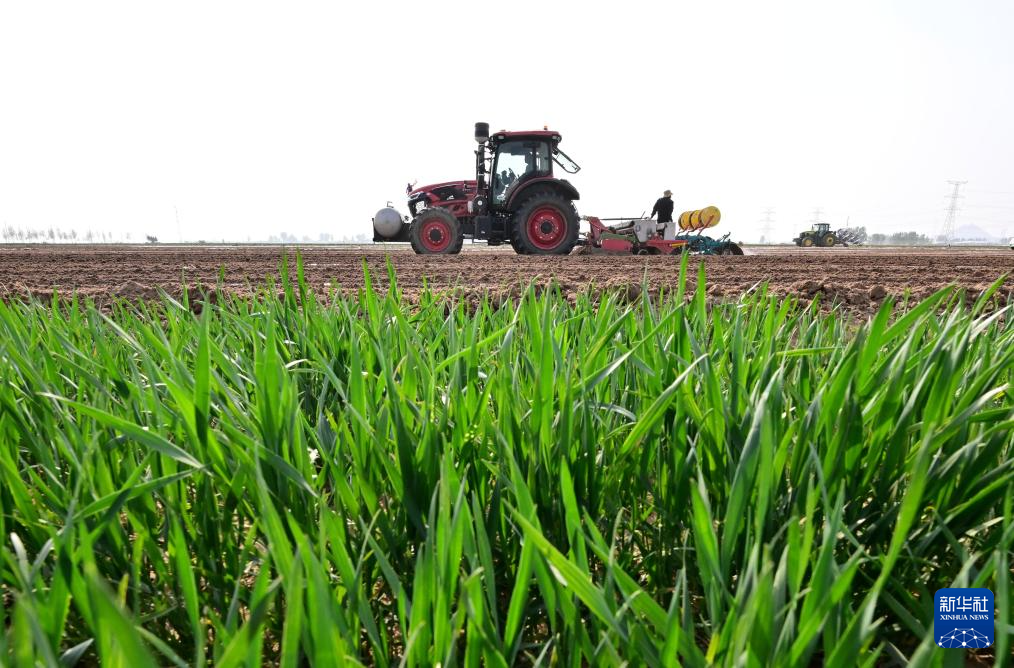 4月17日,河北省滦州市滦城街道陈庄村的农民在田间使用农机播种花生。