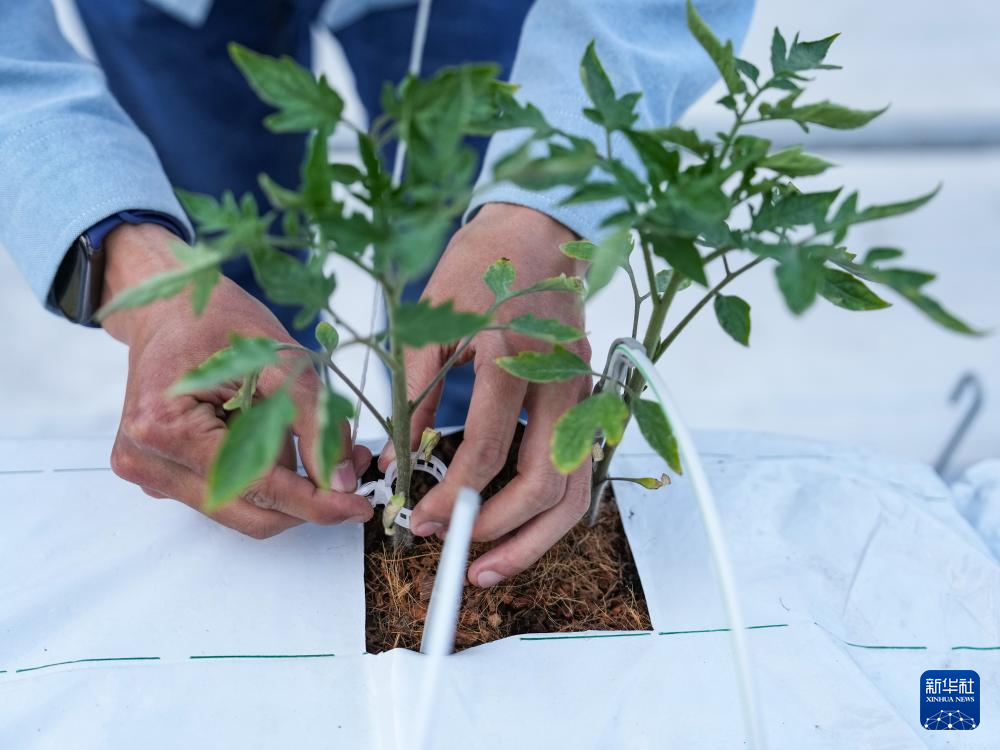 4月17日,技术人员和工人在标准化育苗试验温室为正在进行培育的番茄苗装上番茄夹。
