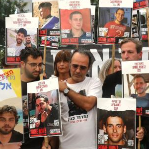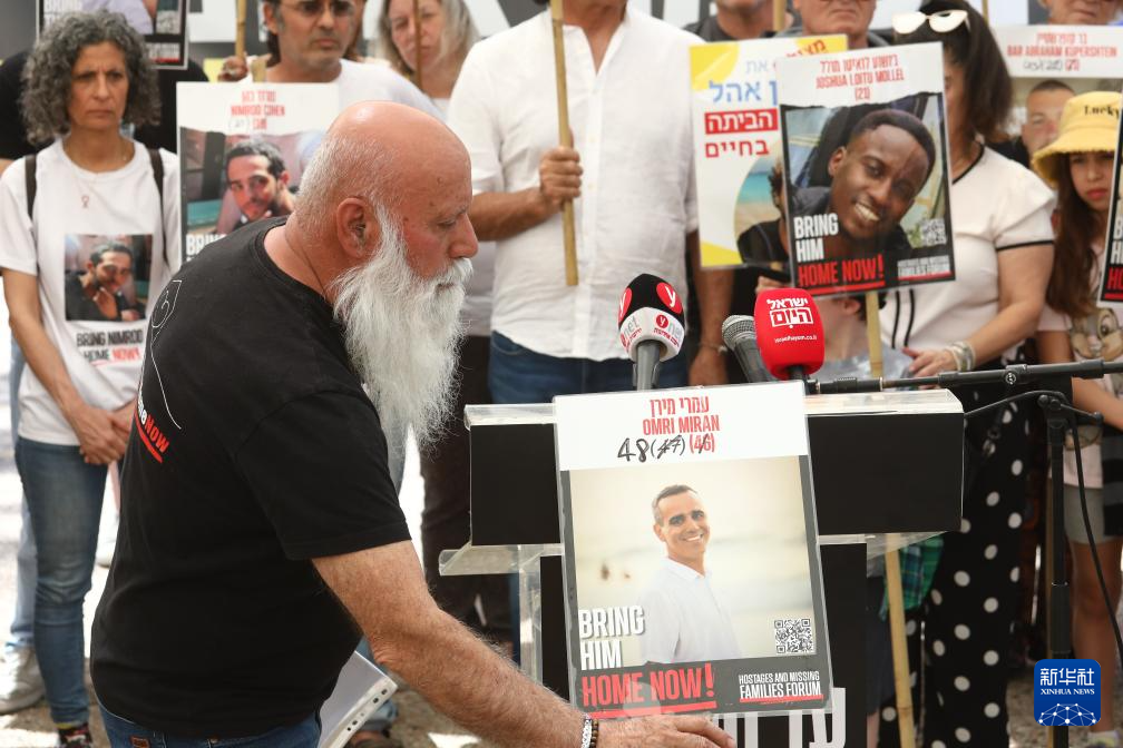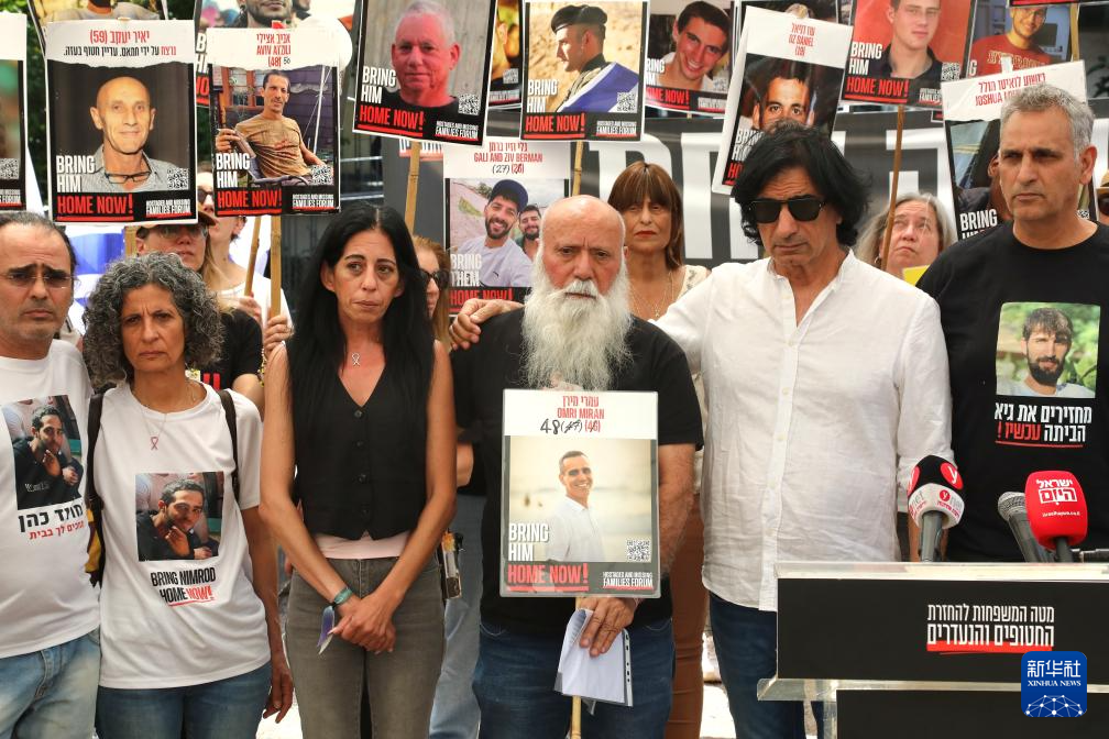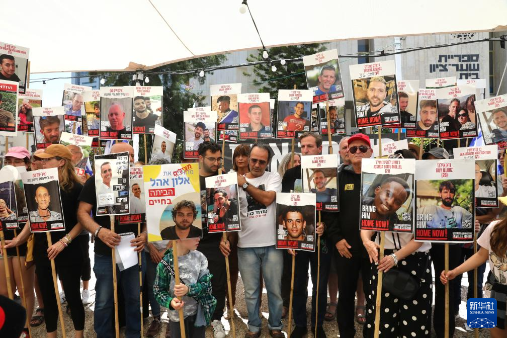 4月18日,在以色列特拉维夫的一处广场,被扣押人员家属举行记者会,要求以政府推动释放被扣押人员。
