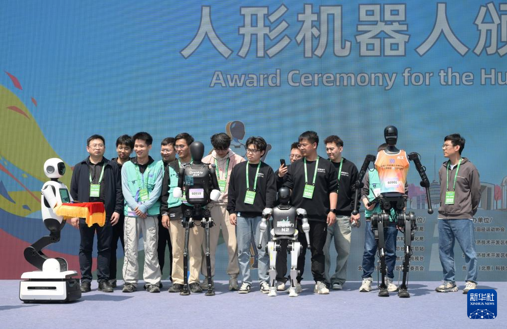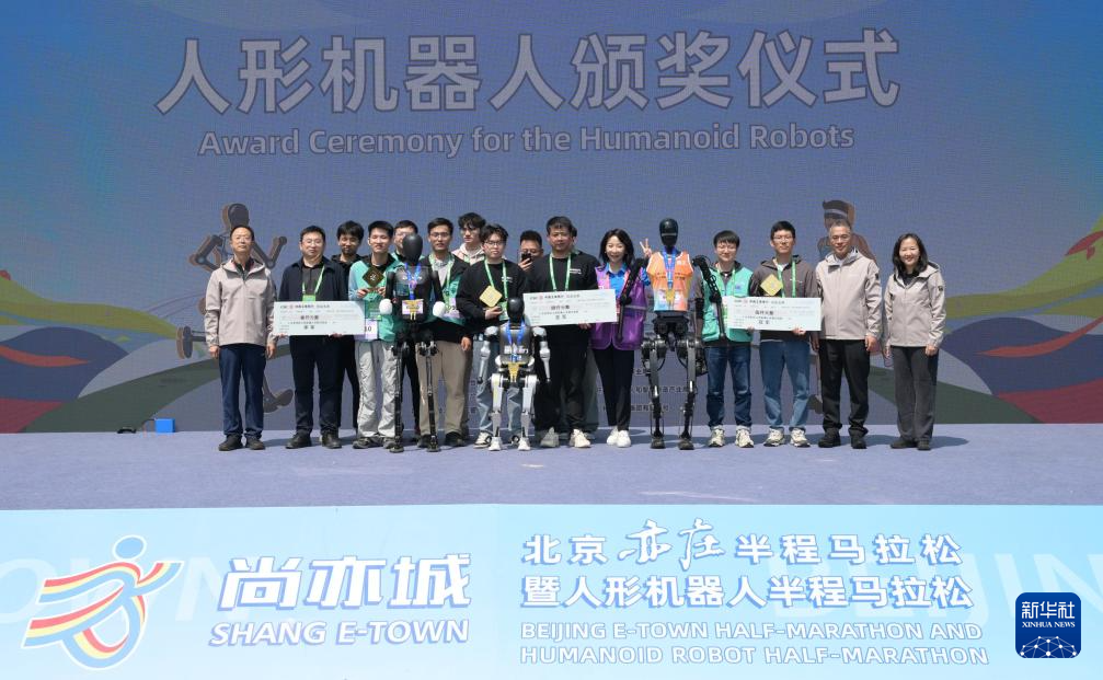 4月19日,冠军天工队选手天工Ultra(右五)、亚军小顽童队选手松延动力N2(下)和季军行者二号队选手行者二号(左六)及其工程师团队在颁奖仪式上。