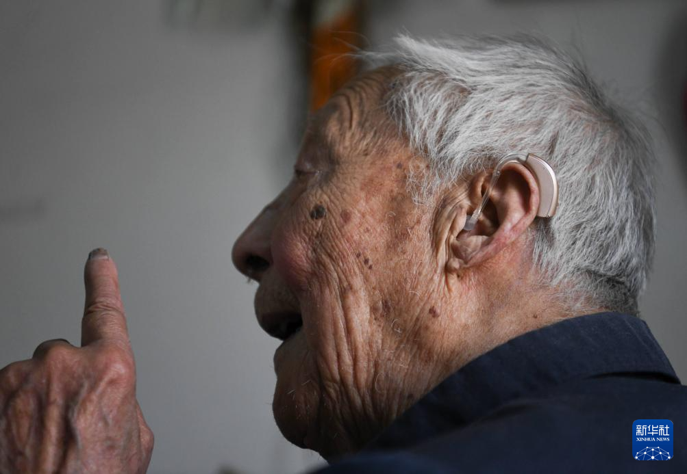 4月8日,在卜陈村“留守未成年人之家”,叶连平佩戴助听器与学生家长交流。