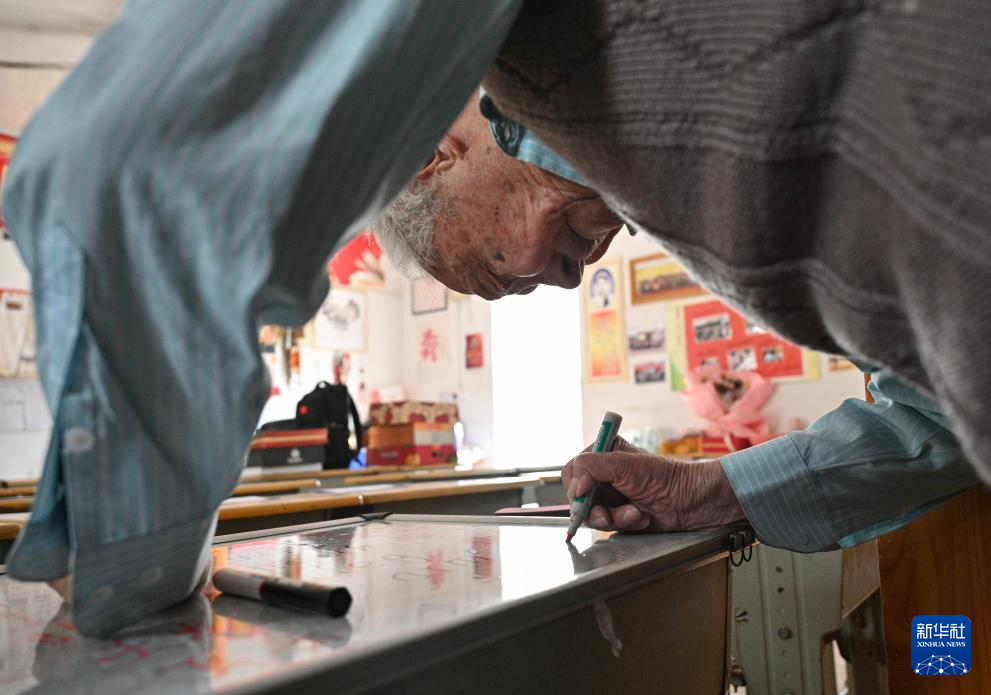 4月8日,在卜陈村“留守未成年人之家”,叶连平写板书时用手紧抓黑板,以支撑身体。