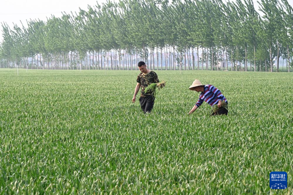 4月20日,康建庄(右)和康开放父子俩在自家麦田拔草。