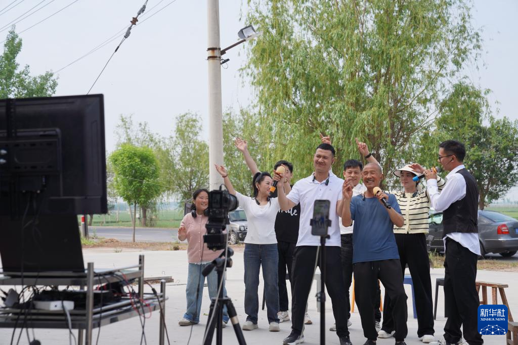 4月21日,康建庄(前中)和“康开放(前左)父子俩在直播唱歌。