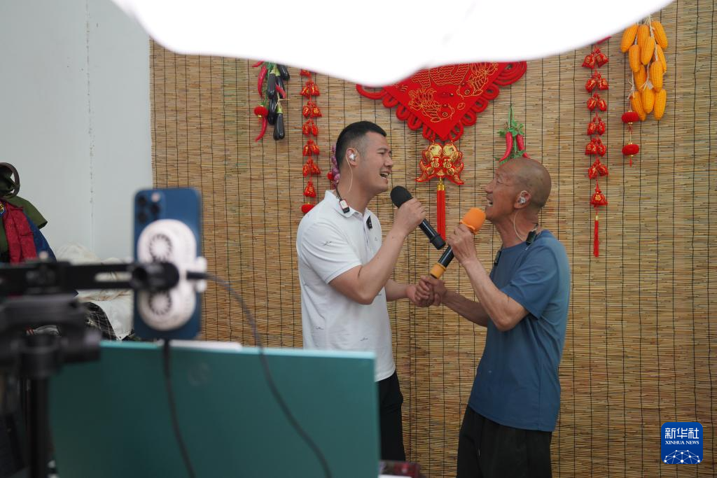 4月21日,康建庄(右)和康开放父子俩在村里直播唱歌。