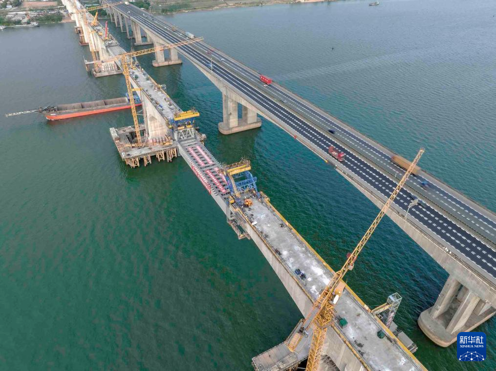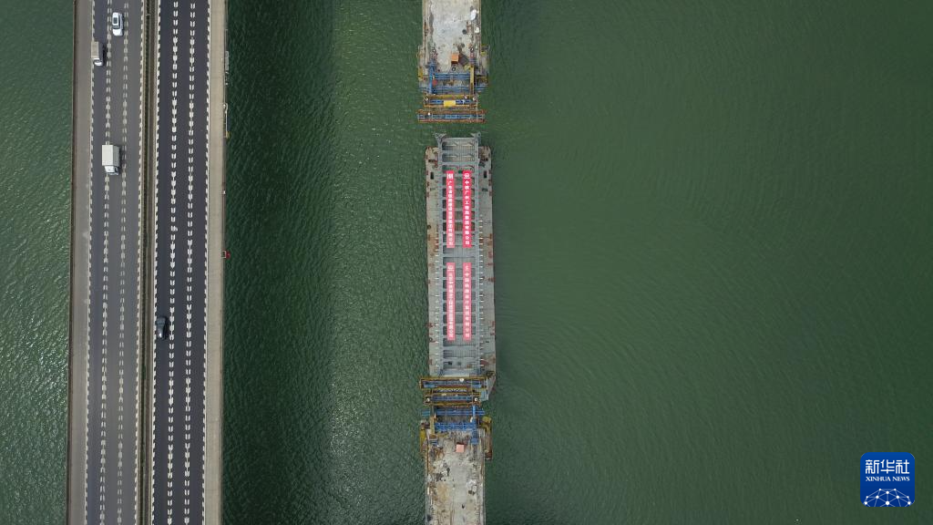 4月22日,跨西江钢混混合连续刚构桥最后一节钢箱梁向合龙处提升(无人机照片)。
