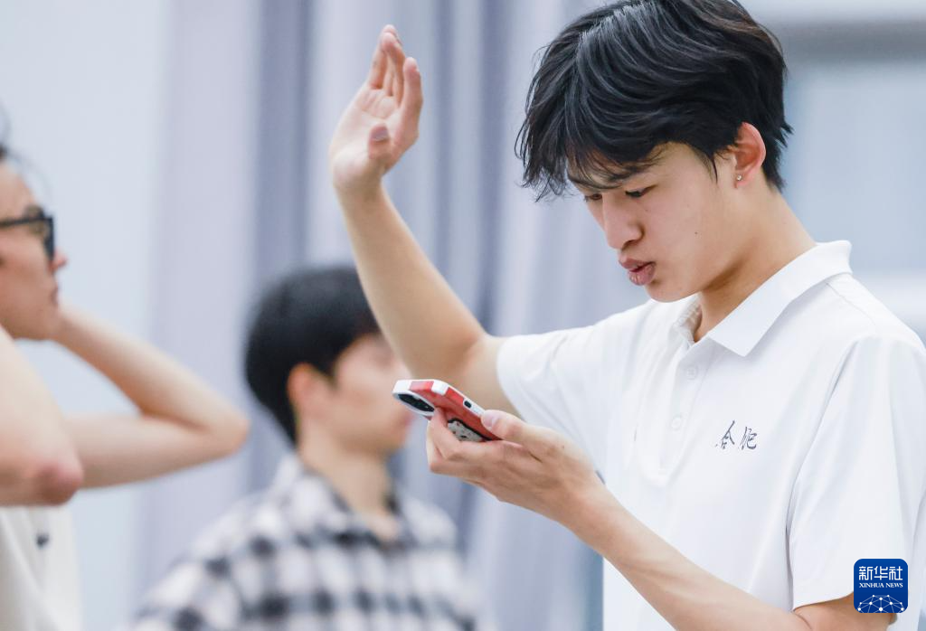 4月14日,罗昊在排练群舞《阳光下的麦盖提》间隙观看手机视频纠正自己的舞蹈动作。