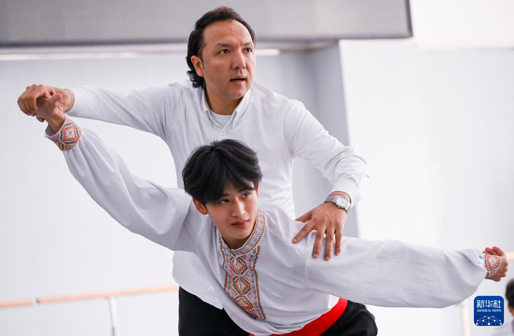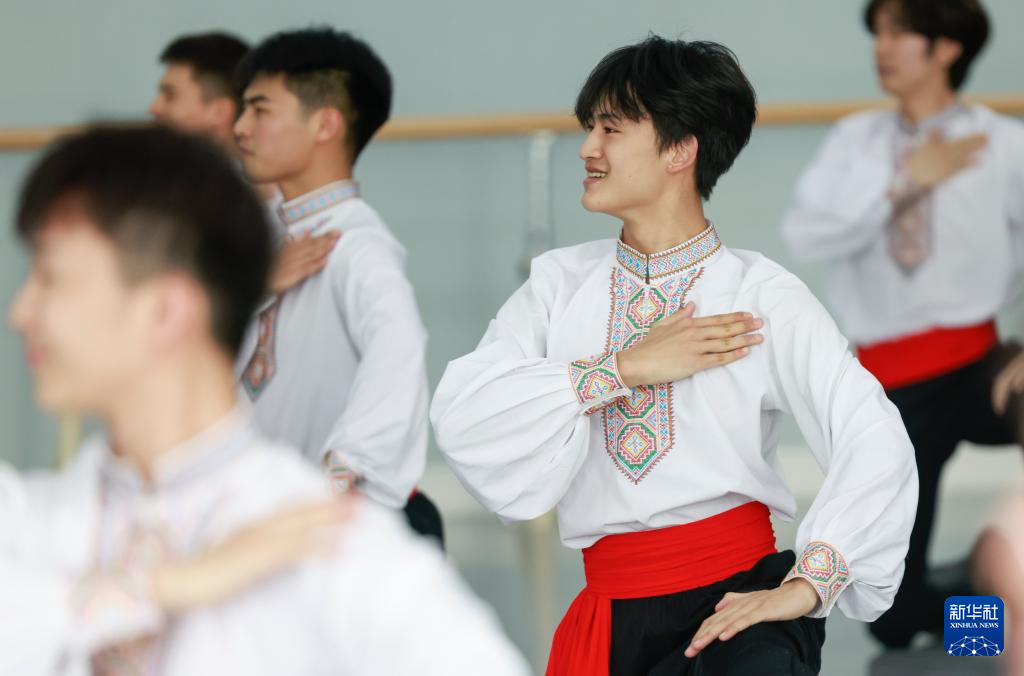 4月14日,罗昊(左)和同学在舞蹈学院专业技能课教室里排练群舞《阳光下的麦盖提》。
