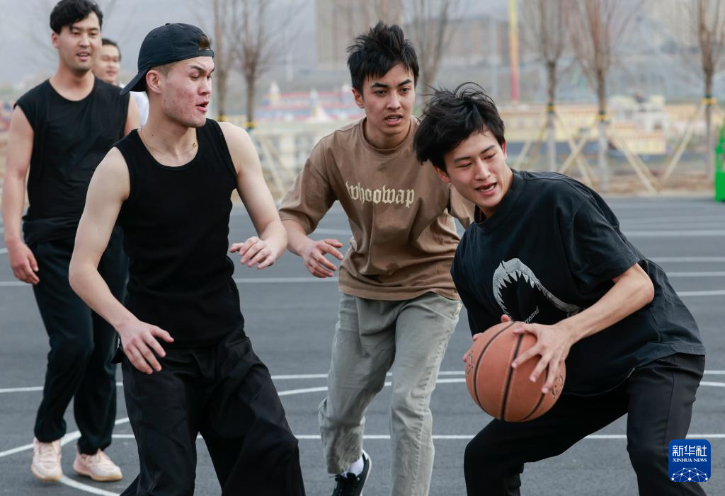 4月18日,罗昊(右)和同学在新疆艺术学院篮球场上打球。