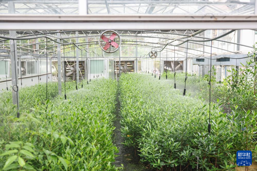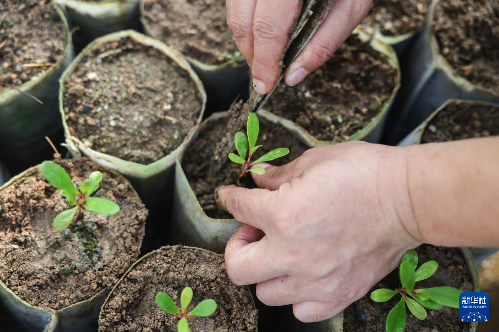 4月9日,曾德华在三亚市林业科学研究院温室大棚里移栽红榄李幼苗。