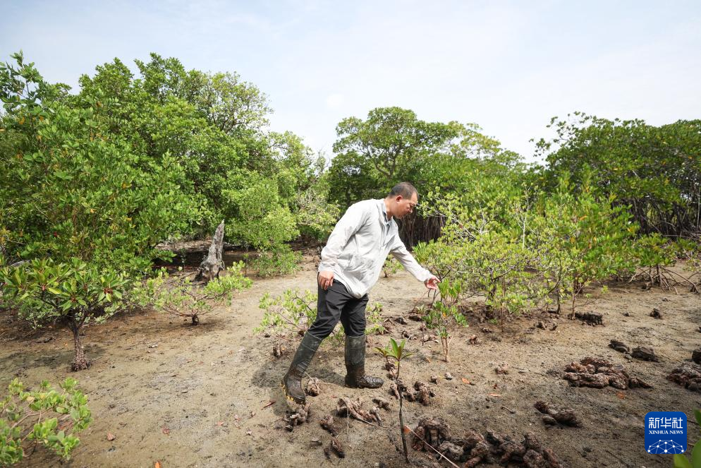 4月9日,在三亚铁炉港红树林自然保护区,曾德华查看之前种植的红榄李幼苗生长情况。