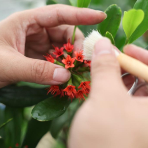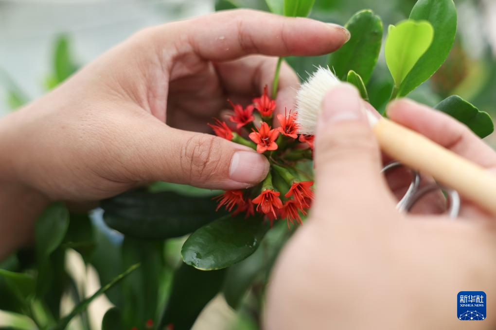 4月10日,三亚市林业科学研究院技术员王炳宇在温室大棚内对红榄李进行人工授粉实验。