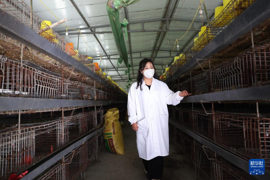 康县阳坝镇梅园太平山鸡养殖专业合作社负责人徐巍芹在孵化鸡舍查看鸡苗生长情况(4月22日摄)。