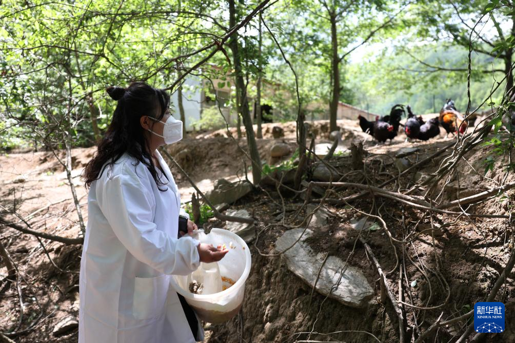 康县阳坝镇梅园太平山鸡养殖专业合作社负责人徐巍芹在树林中给太平鸡喂食(4月22日摄)。