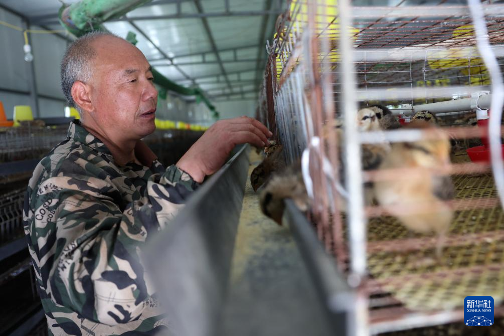 在康县阳坝镇梅园太平山鸡养殖专业合作社,一名工作人员在查看鸡苗生长情况(4月22日摄)。
