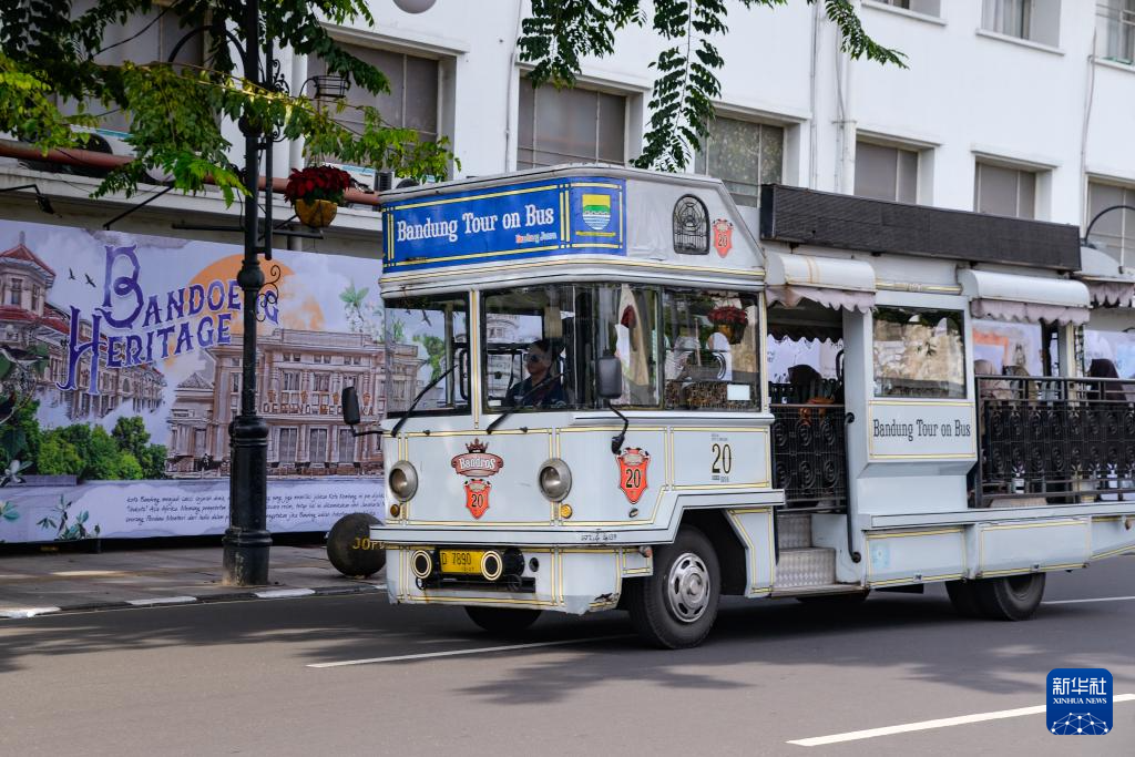 4月23日,在印度尼西亚万隆,一辆万隆旅游公交车行驶在亚非大道。