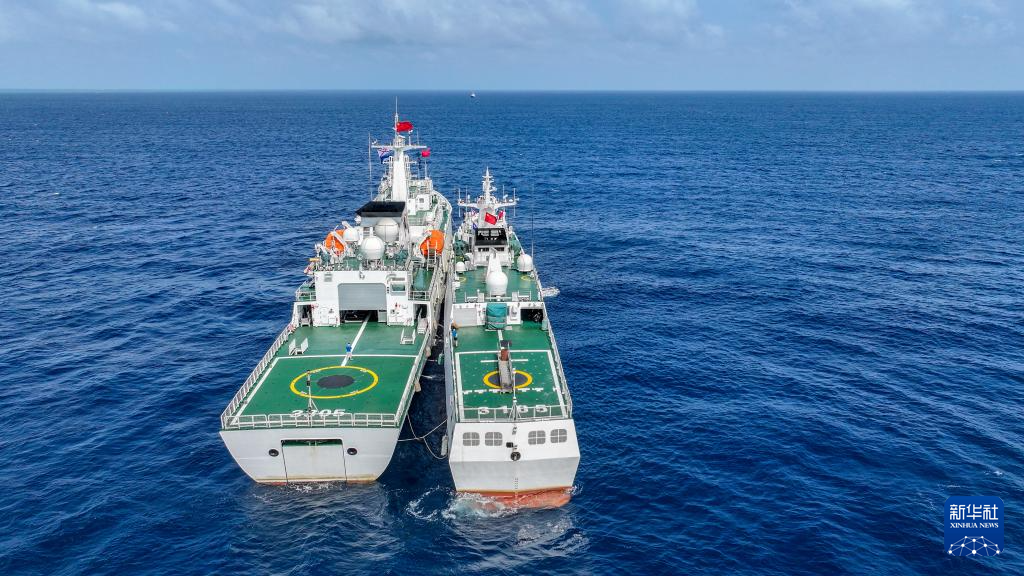 3月21日,在中国黄岩岛附近海域,高栏舰与海警鹤宝舰开展海上燃油补给训练(无人机照片)。