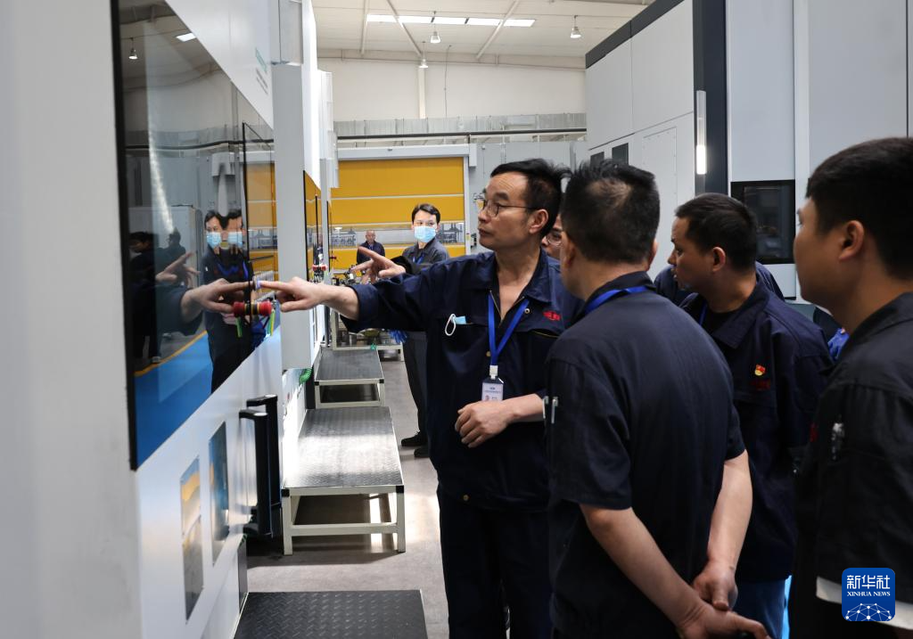 4月25日,工人在产线上熟悉新安装的数控机床操作技术。