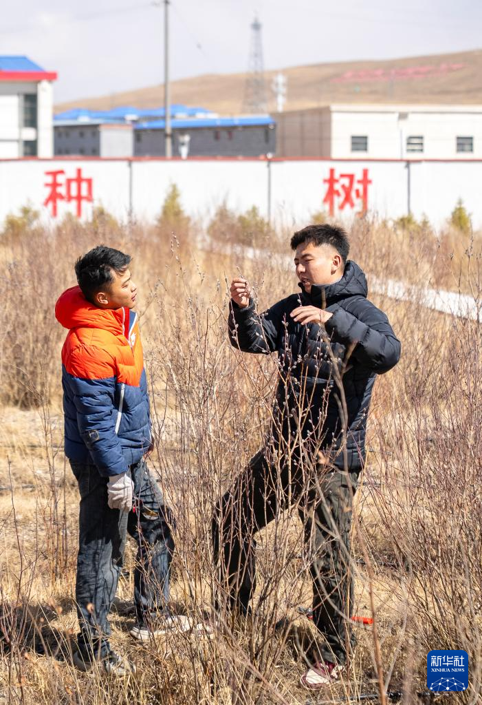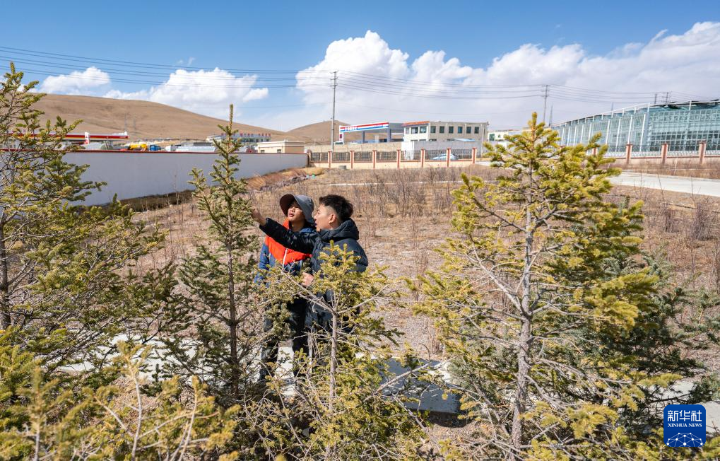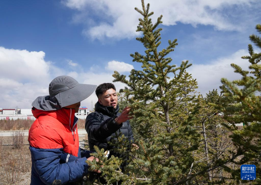 4月25日,那曲市林业和草原局工作人员在查看树苗长势。