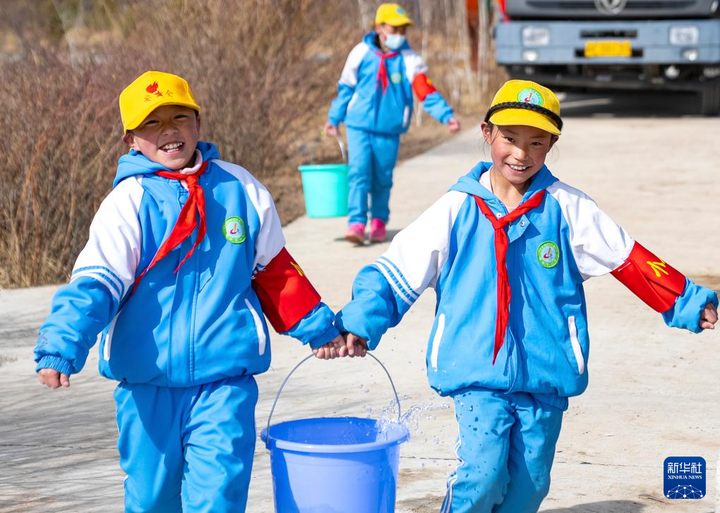 4月25日,几名那曲市小学四年级学生在搬水准备给树苗浇水。