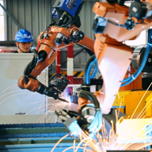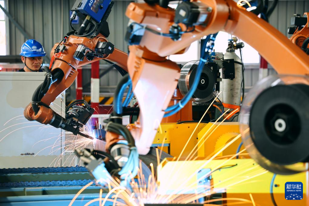 4月27日,深圳外环田头山隧道群钢筋场的机器臂在焊接拱架。