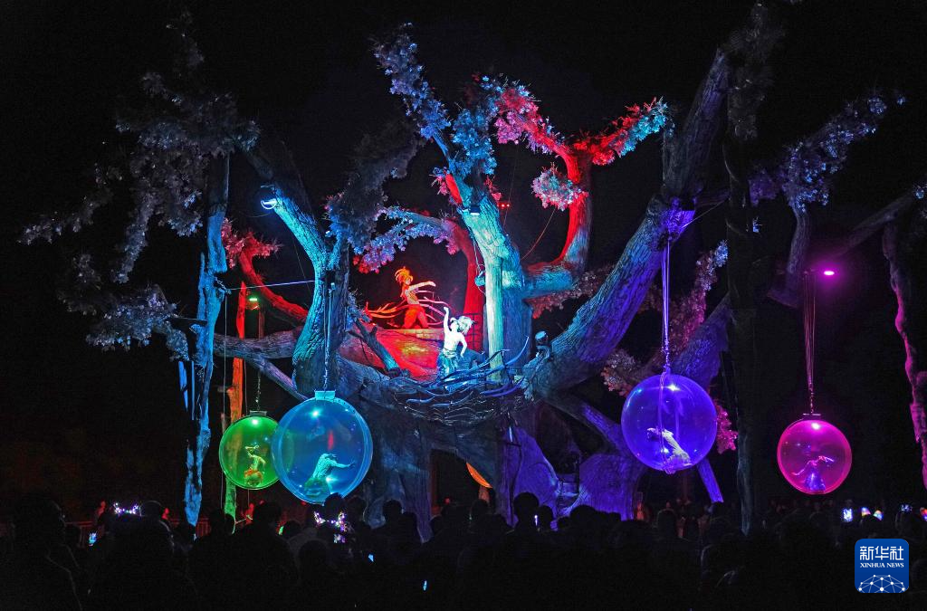 夜幕降临,大型山水实景演出《寻梦龙虎山》在泸溪河畔上演。观众们先徒步,后乘船,穿越2公里自然山水画卷,沉浸式观赏这场视觉盛宴。剧中,300余名演员与自然景观互动,融合了舞蹈、戏剧、武术、杂技等演出形式,让道教神话、古越民俗与丹霞地貌交相辉映。自2015年正式公演以来,《寻梦龙虎山》累计演出近2800场,接待观众近130万人次,成为江西文旅的“现象级”产品。