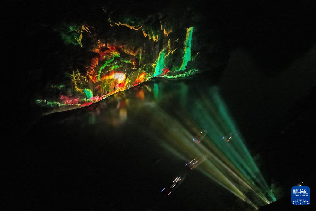 这是山水实景演出《寻梦龙虎山》现场,游客乘船观看天然崖壁上的裸眼3D投影(无人机照片,3月24日摄)。