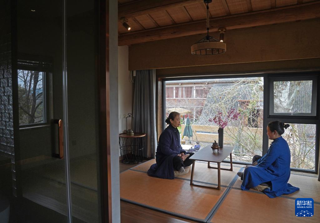 游客在道文化主题民宿“栖山居”休息(3月6日摄)。