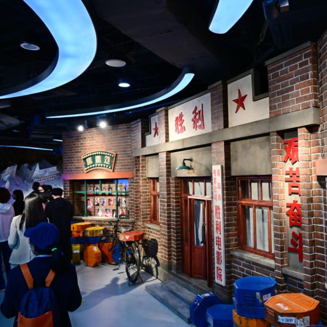 4月28日,观众在青岛电影博物馆胜利电影院场景复原展区参观。