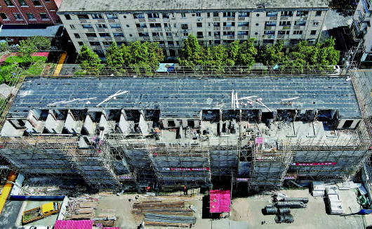 8月6日,上海市闵行区江川路街道电机四村居民楼加装电梯的施工现场。本报记者方喆摄