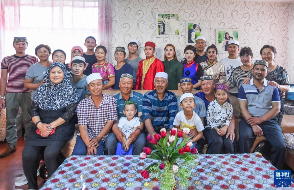 这是家住内蒙古呼伦贝尔的夏民山(前排右三)家的家庭合影。他家由回族、汉族、蒙古族、达斡尔族、鄂温克族、满族共6个民族组成,45口人,三代同堂(2017年7月16日摄)。新华社记者 连振 摄