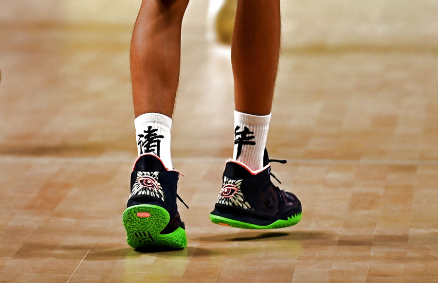 这是9月18日在全运会五人制篮球男子19岁以下组比赛中拍摄的辽宁队球员逄砚钧的球袜。