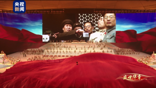 随着《东方红》乐曲响起,“鸟巢”上空绚烂的焰火,绽放出五颗金色五角星,这是全体中国人无限荣光的历史时刻。大屏幕上开国大典的珍贵画面,是首次通过8K修复,在超大空间、超大屏幕上的震撼呈现。
