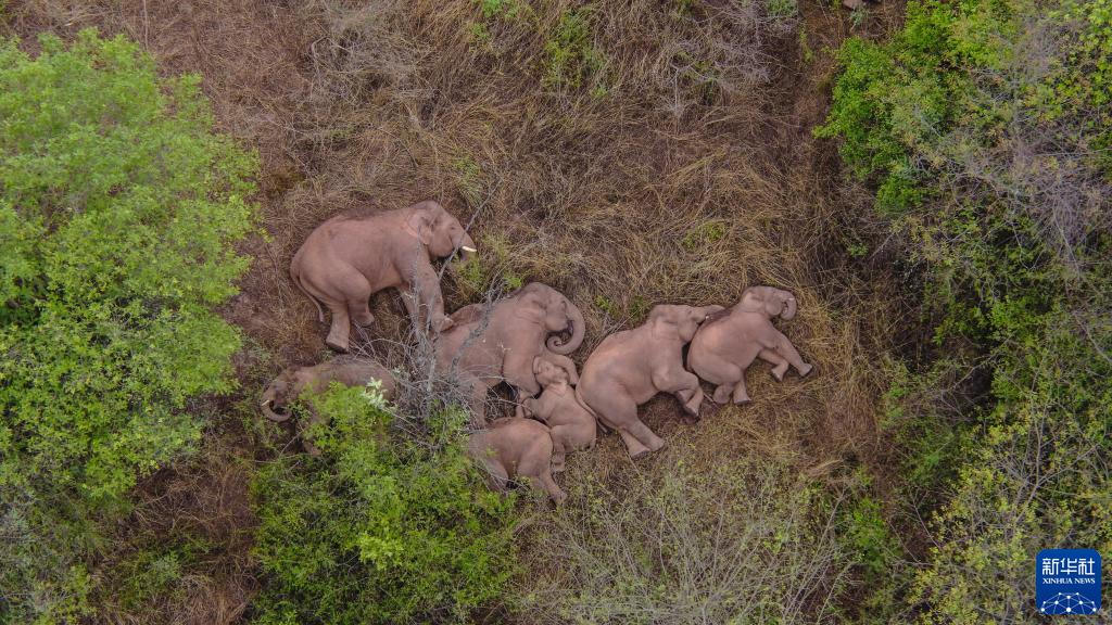 2021年6月7日在云南昆明市晋宁区夕阳彝族乡拍摄的野象(无人机照片)。新华社发
