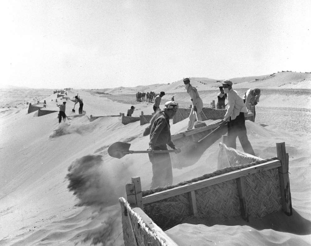 1961年11月8日,治沙工人在包兰铁路沿线固定流沙的草方格中栽种沙生植物。新华社记者 李福铸 摄