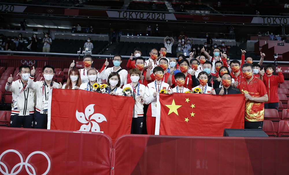 图为中国乒乓球队成员和中国香港乒乓球队成员在颁奖仪式后合影。新华社记者 王东震 摄