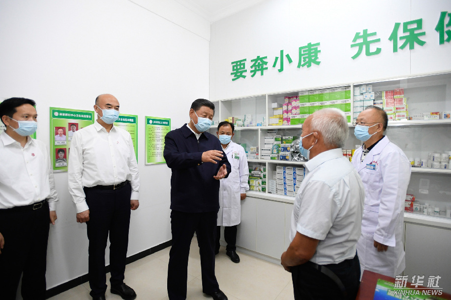 9月14日下午,习近平在陕西省榆林市绥德县张家砭镇郝家桥村卫生站同村里的老人、医护人员亲切交流。