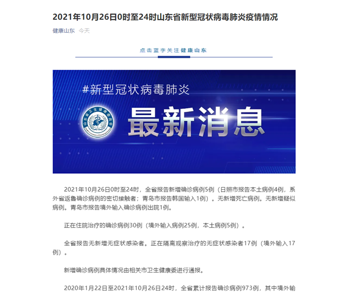 2021年10月26日0时至24时,全省报告新增确诊病例5例(日照市报告本土病例4例,系外省返鲁确诊病例的密切接触者;青岛市报告韩国输入1例)。无新增死亡病例。无新增疑似病例。青岛市报告境外输入确诊病例出院1例。
