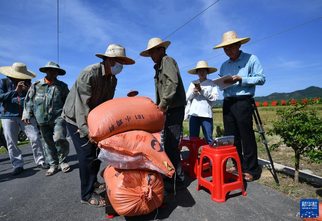 10月26日,工作人员为稻谷称重。新华社记者 郭程 摄