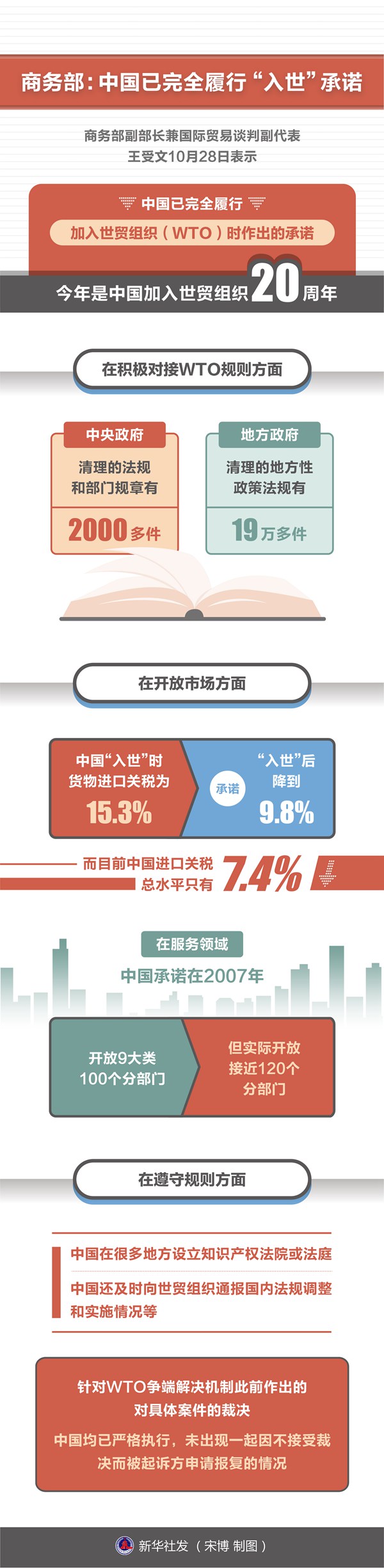 今年是中国加入世贸组织20周年。王受文在国新办当日召开的新闻发布会上说,中国加入WTO时,明确了中国履行“入世”义务的时间表。“对照时间表可以发现,中国作出的承诺已得到完全履行”。
