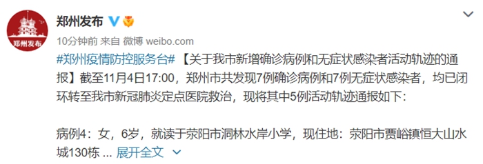 截至11月4日17:00,郑州市共发现7例确诊病例和7例无症状感染者,均已闭环转至我市新冠肺炎定点医院救治,现将其中5例活动轨迹通报如下: