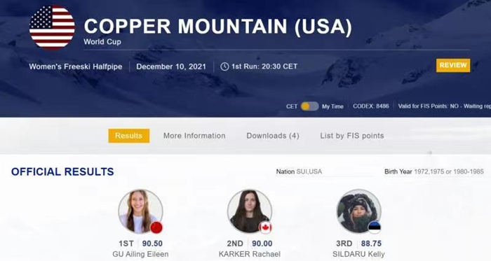 刚刚,2021/2022赛季自由式滑雪U型场地世界杯美国铜山站比赛落下帷幕,现世界排名第一的中国选手谷爱凌以90.50分的成绩夺得冠军,另一名中国选手张可欣以82.00分获得第七名。