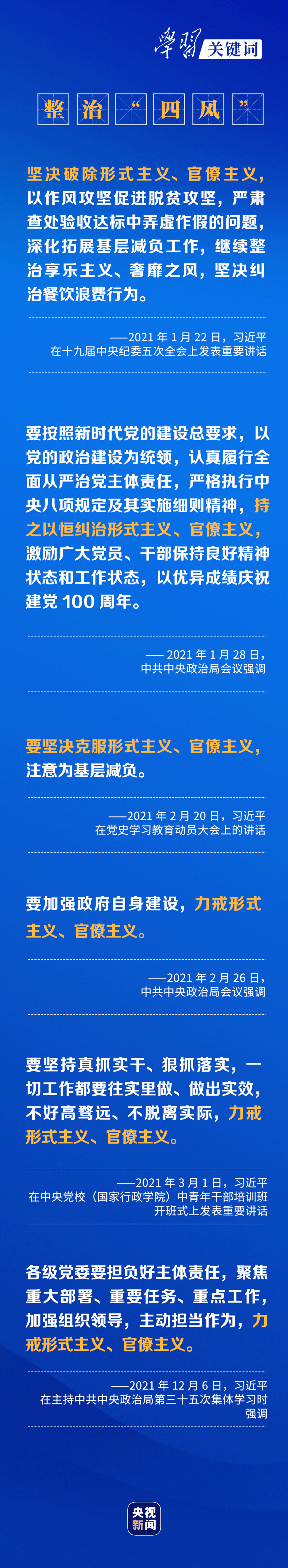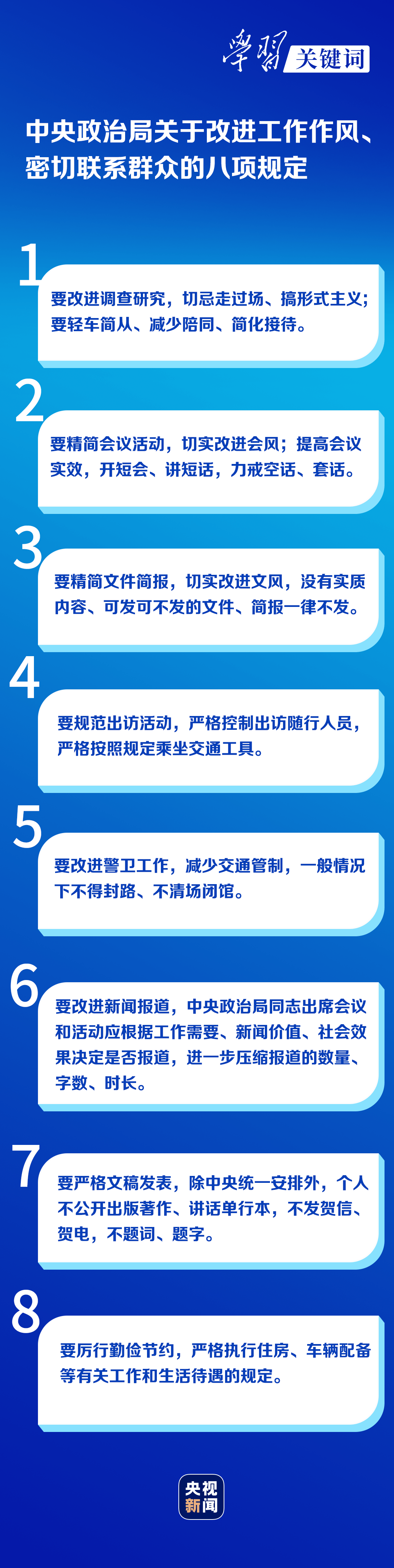 2021年6月18日,在刚刚开馆的中国共产党历史展览馆参观时,习近平总书记在八项规定展板前停下脚步、仔细察看:“现在这里面的8条,精简会议活动、改进警卫工作、改进新闻报道、厉行勤俭节约,做得都不错,还是要反复讲、反复抓……”