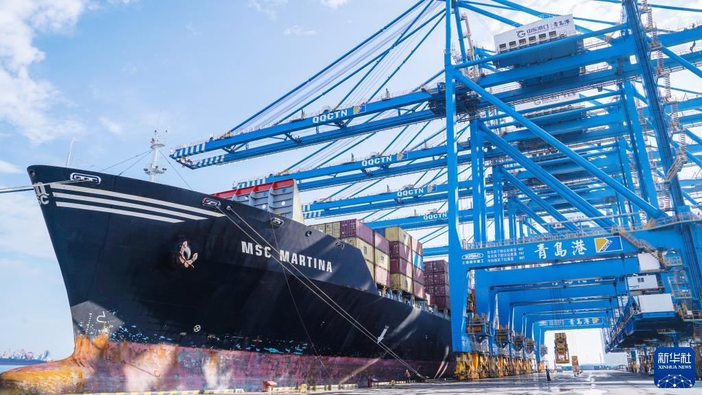 这是8月24日在青岛港拍摄的“地中海马汀娜”轮。当日,“地中海马汀娜”轮的作业中装卸效率达到每小时52.1自然箱,第7次刷新世界纪录。新华社发