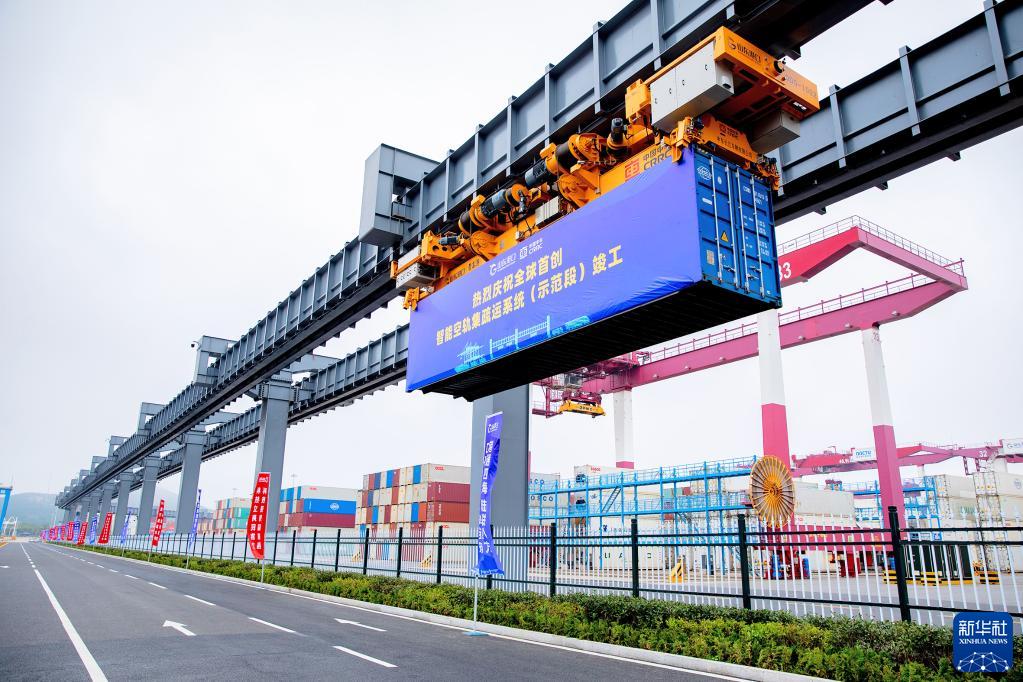6月29日,全球首创智能空中轨道集疏运系统(示范段)在山东港口青岛港自动化码头竣工投入试运营。新华社发